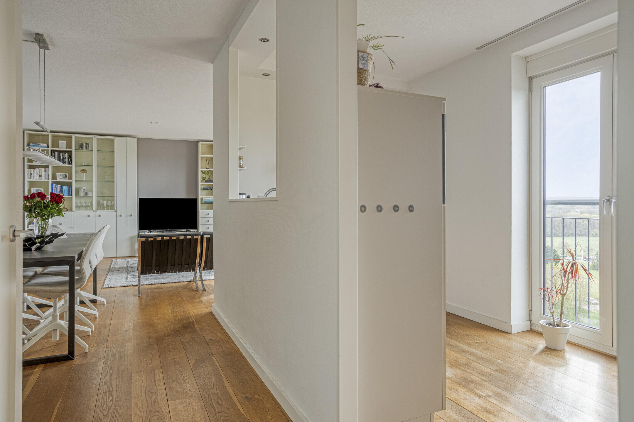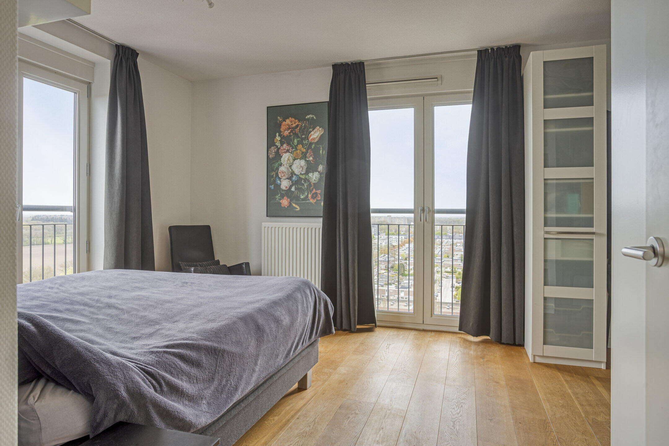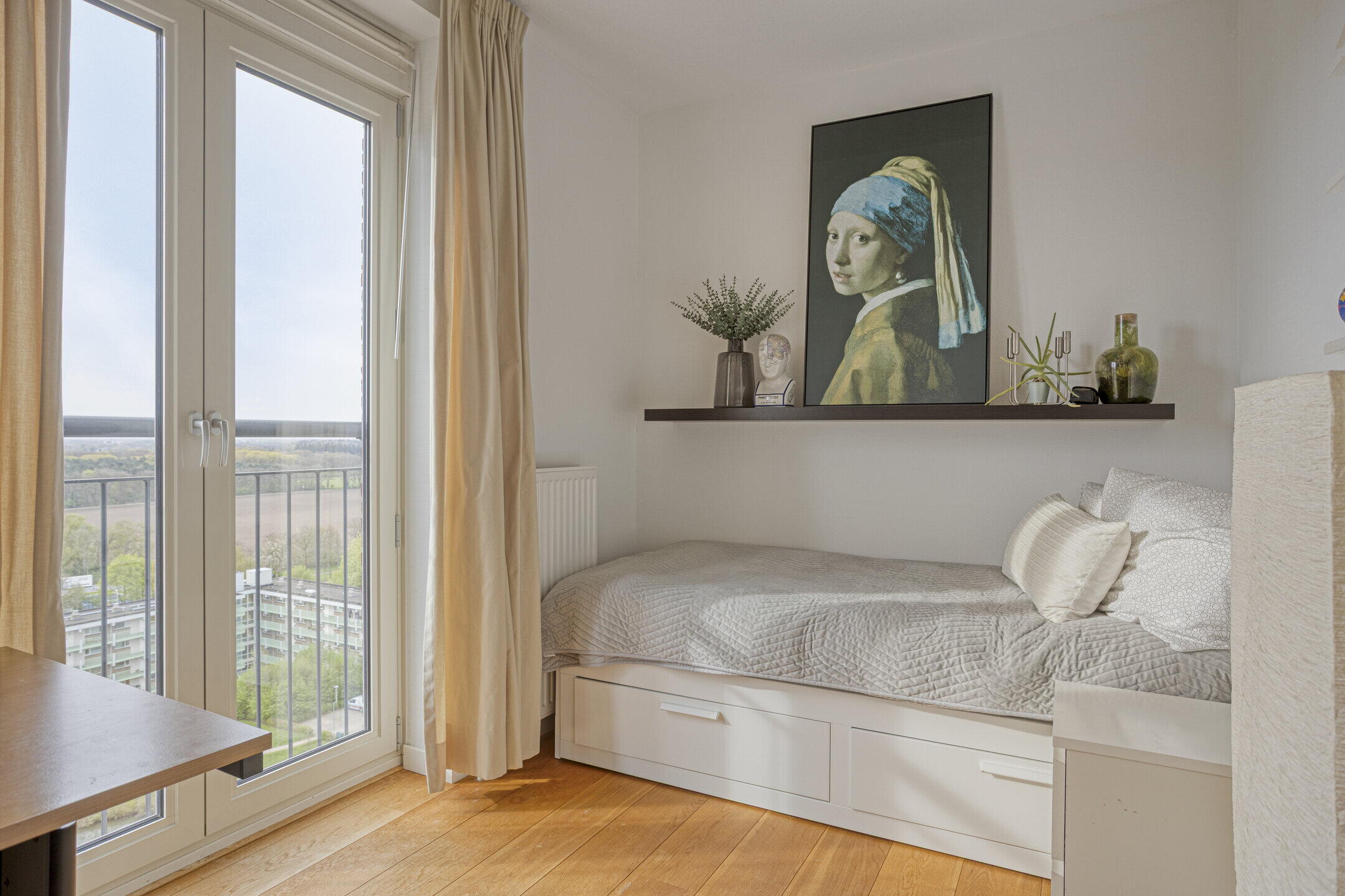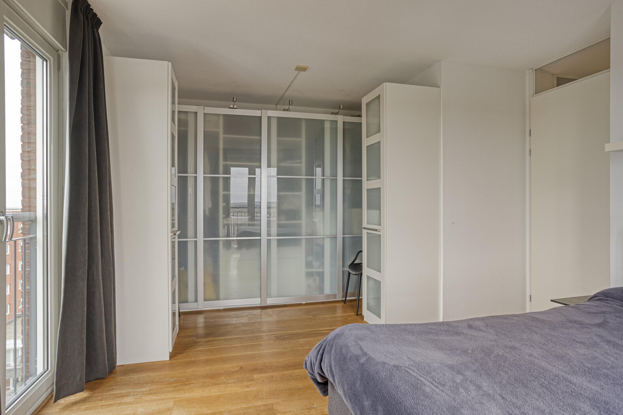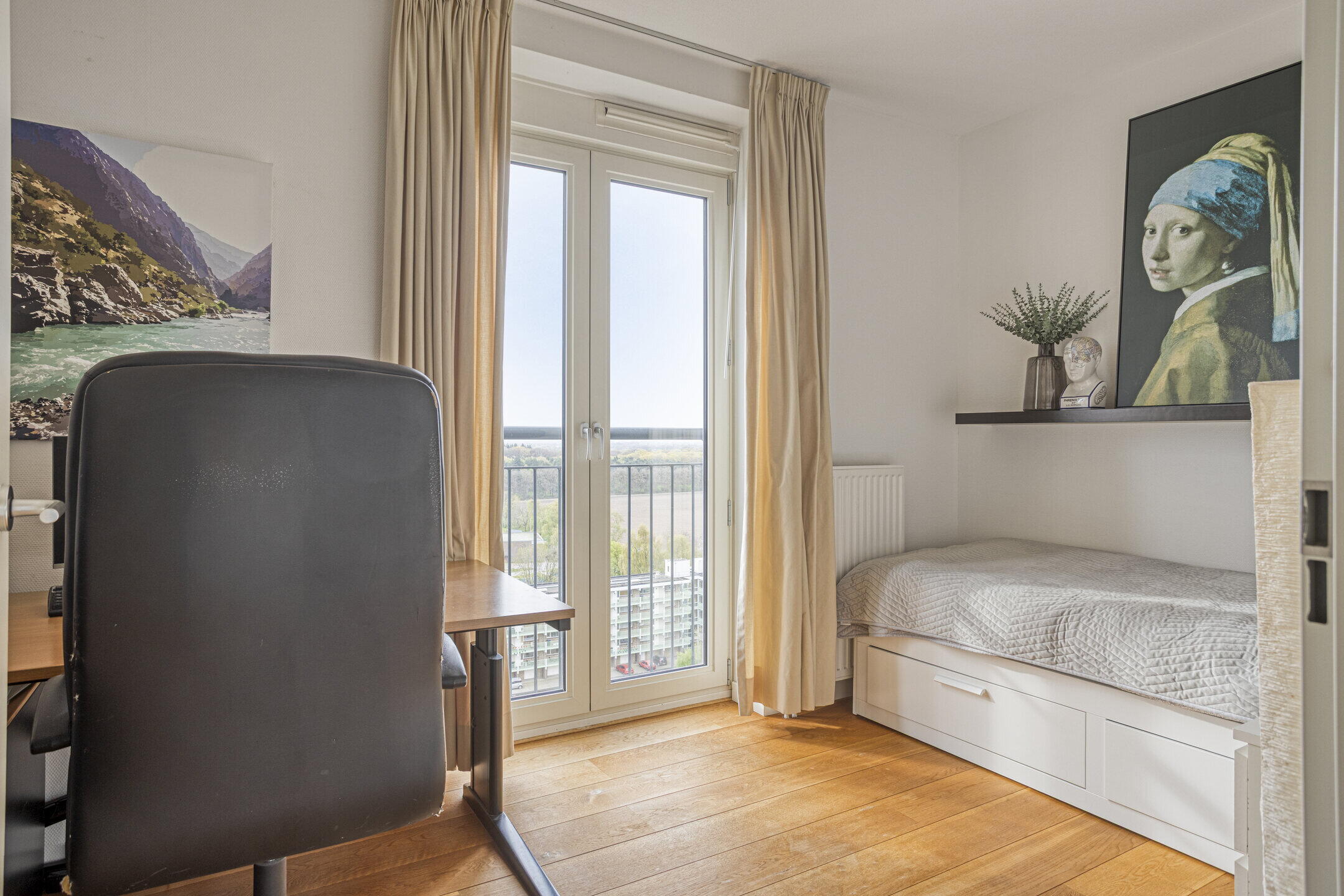 Het tweede gedeelte van het appartement huisvest de 2 slaapkamers en badkamer, die allen via een separate gang (overloop) bereikbaar zijn. De master bedroom is bijna 20 m² en gesitueerd op de zuidwesthoek. U kunt hier makkelijk een groot bed, een zitje en ruime garderobehoek kwijt. De tweede slaapkamer van 9 m² is een ideale logeer- en/of /studeerkamer.