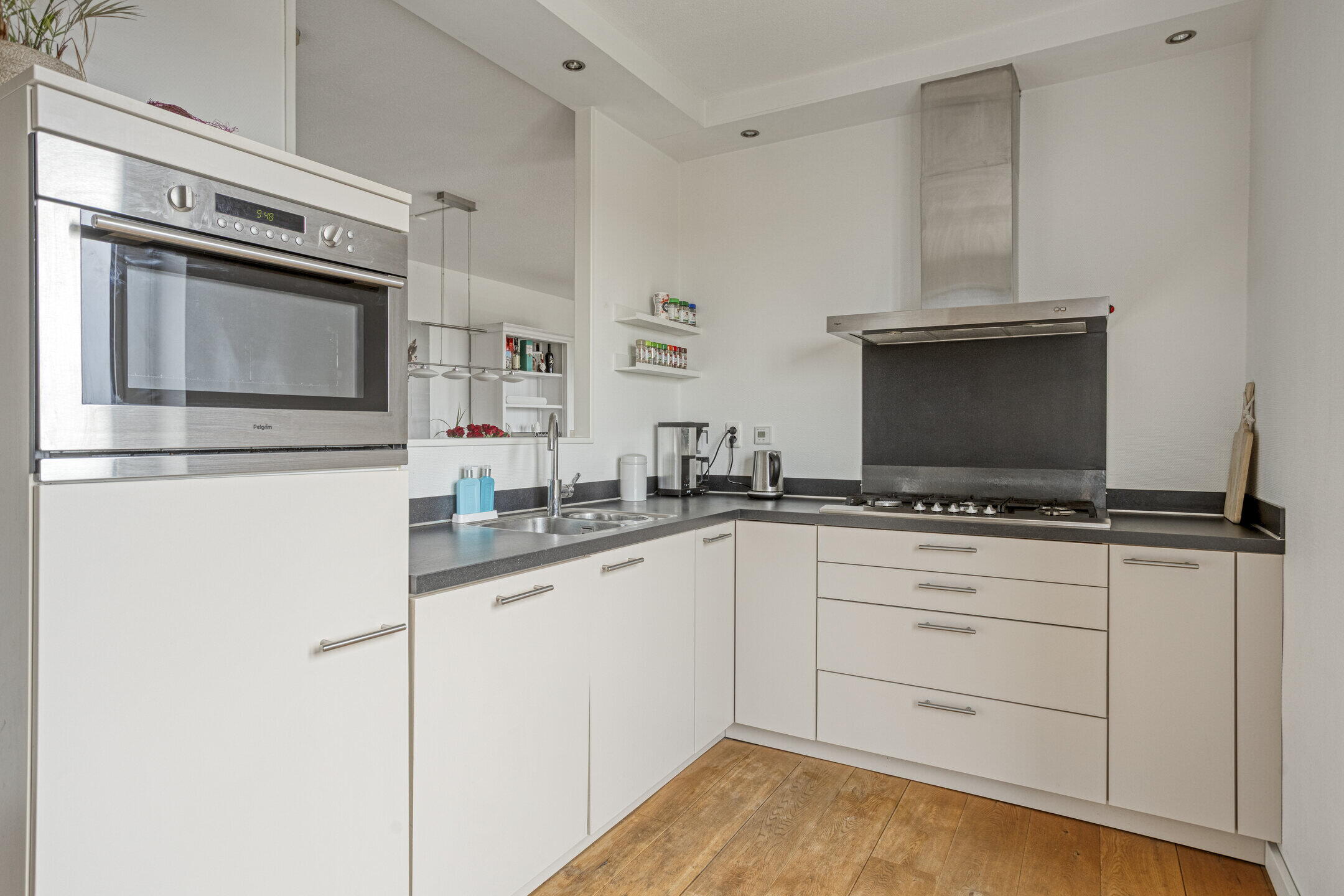De open keuken is ingericht met een hoekopstelling en separate kastenwand. Er is een ingebouwde 5-pits gaskookplaat, afzuigkap, combi-oven, koelkast en natuurlijk een vaatwasser. Het spoelgedeelte met 1½ spoelbak is zo gesitueerd dat via een doorkijk contact houdt met het gezelschap aan de eettafel.