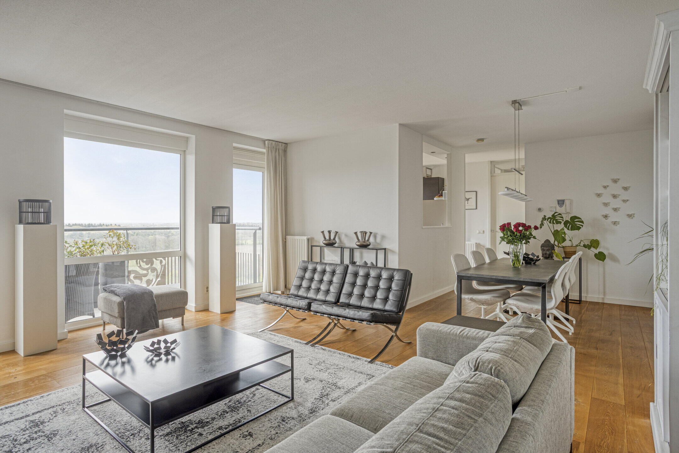 Woonkamer in L-vorm met een ruime zithoek en grenzend aan de keuken een ruimte voor een royale eettafel. Vanuit de woonkamer bereikt u het ruime balkon met zuidoost ligging.