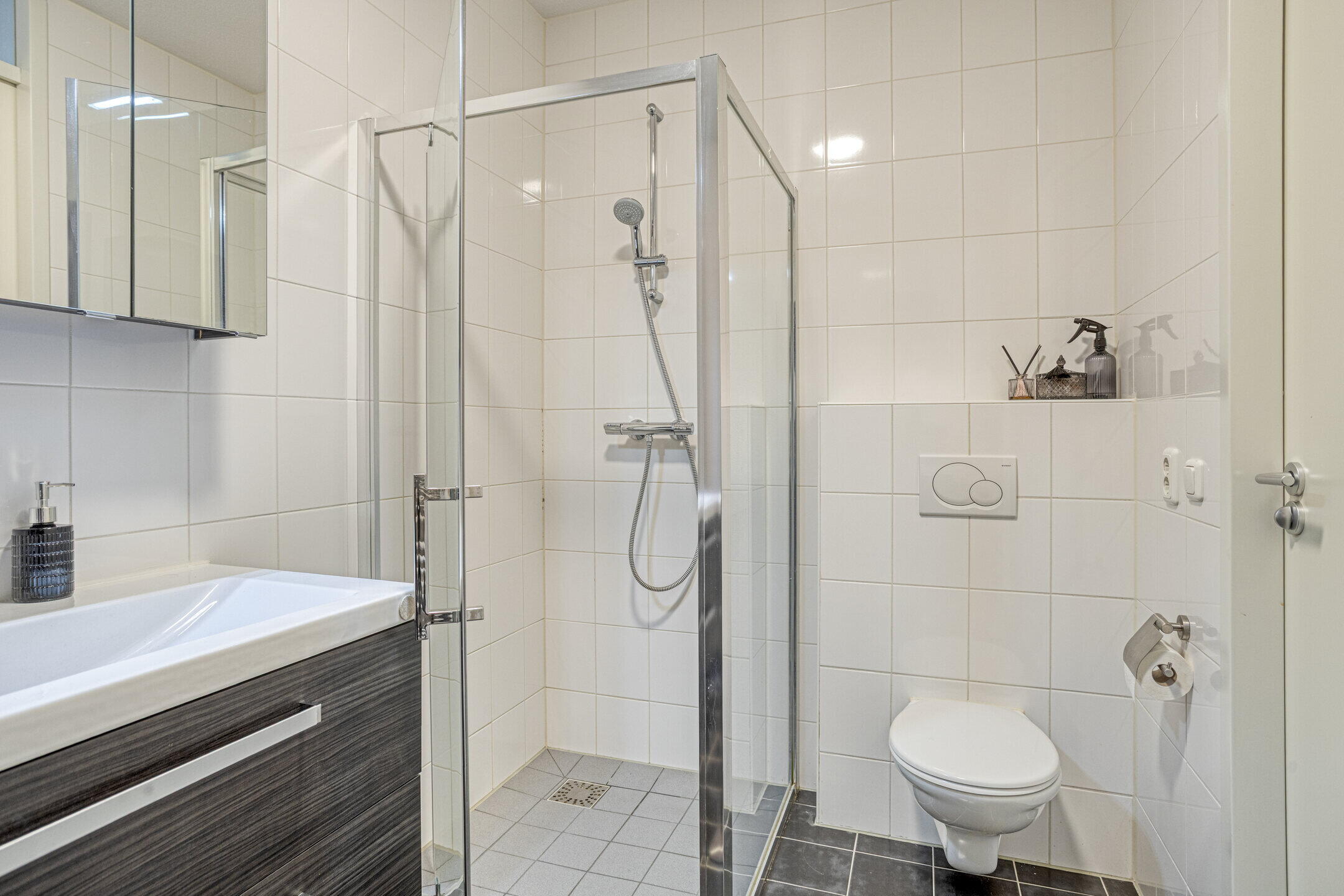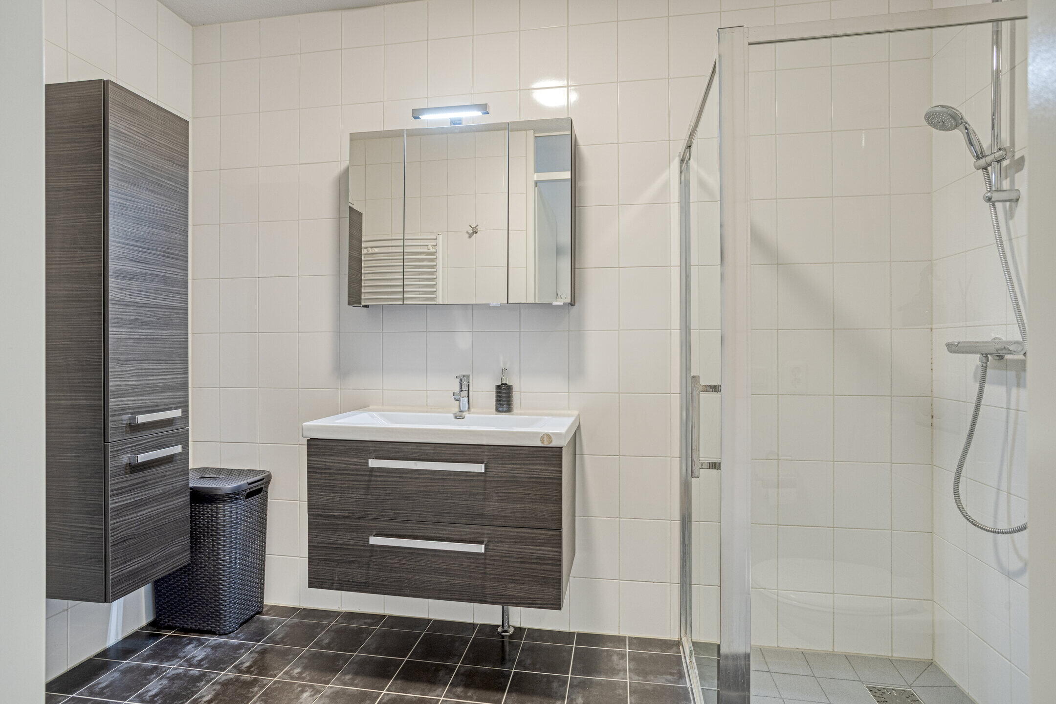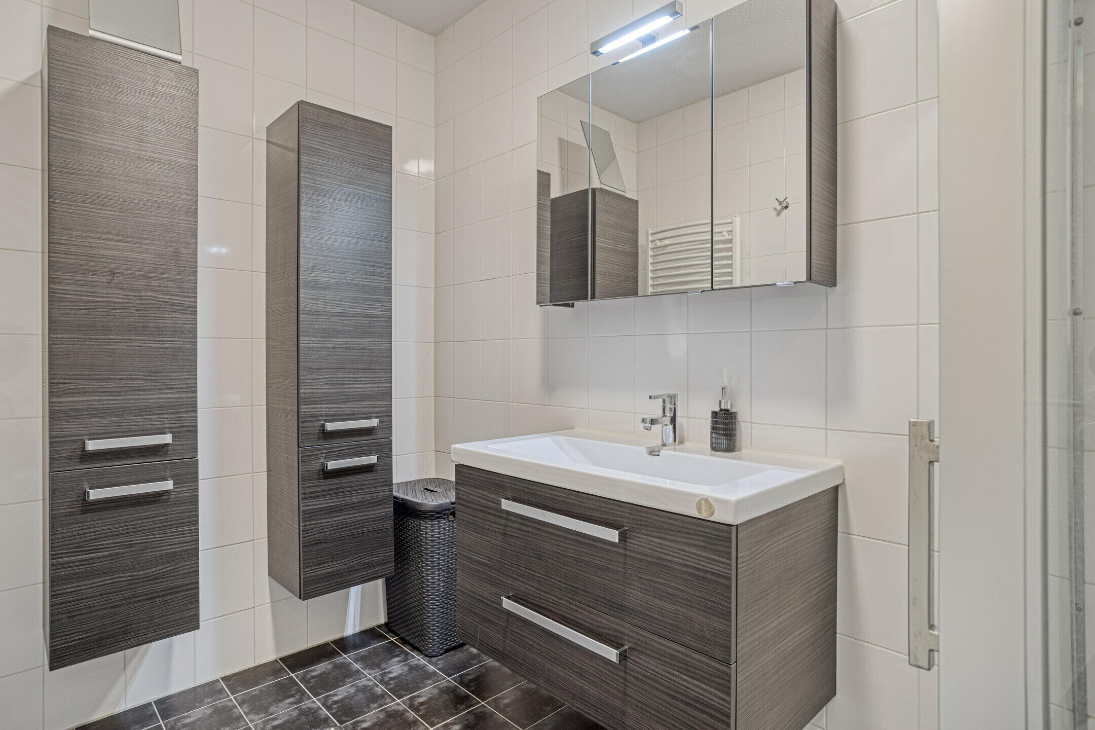 De comfortabele badkamer met douchehoek met glazen wand en deur is voorzien van een thermostaatkraan. Voorts een tweede hangend toilet, een wastafelmeubel met opbergladen, toiletkast met spiegel en een bijpassende hangkast.